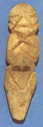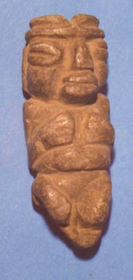 Camahuil antropomorfo tallado en piedra micácea. Técnica: tallado e inciso. Lleva ojos abultados rectos e incisos, boca recta ancha, nariz rectangular, las manos sobre el pecho abultado.