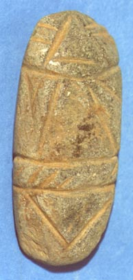 Camahuil antropomorfo tallado en piedra micácea. Técnica: tallado, inciso. Lleva ojos rectos incisos, nariz triangular, boca recta incisa, las manos sobre el pecho formando un triángulo, y en la parte inferior lleva dos líneas incisas formando un triángulo.