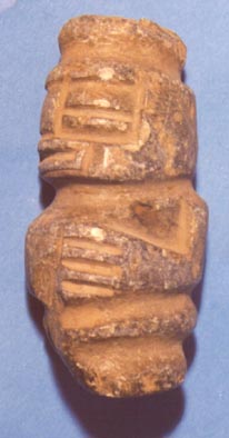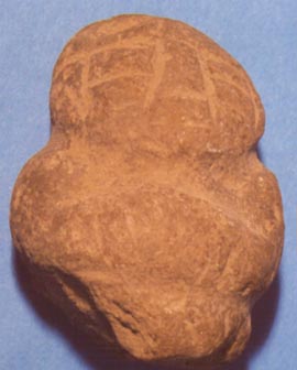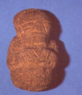 Camahuil antropomorfo tallado en piedra. Lleva ojos cuadrados, nariz trapezoidal, boca recta incisa, las manos sobre el vientre abultado, y la parte inferior es trapezoidal.