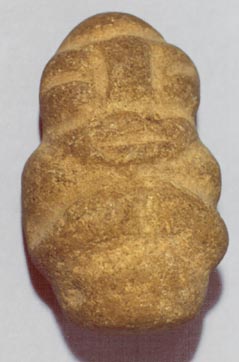 Camahuil antropomorfo tallado en piedra. Técnica: tallado, inciso. Lleva ojos cuadrados, nariz trapezoidal, boca recta incisa, las manos recogidas sobre el pecho, con los dedos incisos. La parte inferior es redondeada.