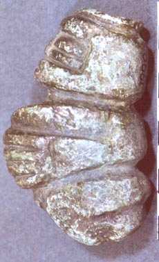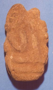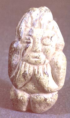 Camahuil antropomorfo tallado en piedra. Técnica: tallado, inciso. El personaje está de rodillas, en perfil, con ojos cuadrados, nariz trapezoidal, boca ancha, los dedos de las manos entrecruzados, sobre el vientre protuberante.