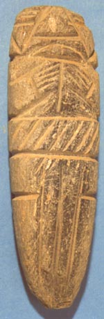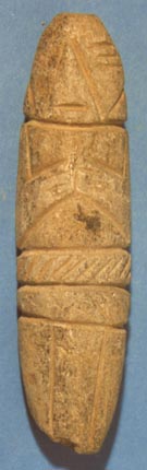Camahuil antropomorfo tallado en piedra micácea. Técnica: tallado, inciso. Presenta ojos cerrados, nariz triangular, boca alargada, las manos sobre el pecho formando un trapecio, y en la cintura lleva una banda en forma triangular. La parte inferior está dividida en dos partes por una línea vertica incisa, que se alarga hasta el final del cuerpo.