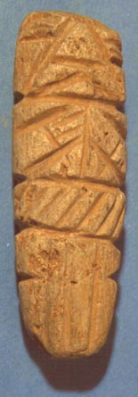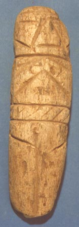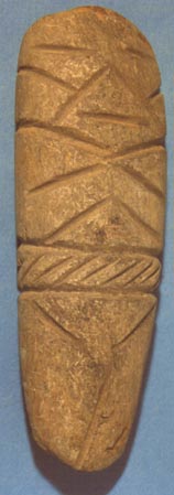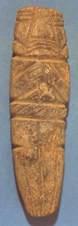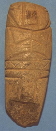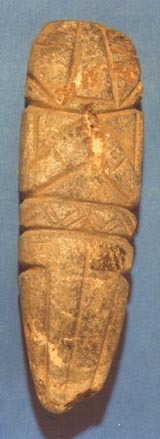 Camahuil antropomorfo tallado en piedra micácea. Técnica: tallado, inciso. Lleva ojos incisos alargados, nariz trapezoidal alargada, las manos sobre el pecho formando un triángulo. En la cintura lleva dos bandas. La superior lleva incisos motivos entretejidos; la inferior en forma de T está dividida en dos partes por una línea vertical, y se extiende hasta…