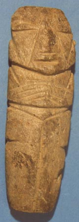Camahuil antropomorfo tallado en piedra micácea. Técnica: tallado, modelado. Lleva ojos cerrados, alargados, nariz trapezoidal, boca incisa en forma de arco, manos sobre el pecho formando un triángulo. En la cintura lleva una banda con diseño de líneas verticales diagonales. En la parte inferior lleva una decoración incisa en forma de T, dividida en dos…