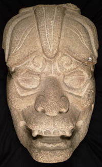 Escultura pedestal tallada en forma de cabeza zoomorfa. Lleva ojos redondeados, boca abierta y carece de nariz. Está expuesta en la Facultad de Odontología de la Universidad Francisco Marroquín.