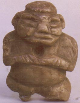Figurilla tallada en mármol, que representa una figura antropomorfa, sentada y con las manos recogidas en el pecho. Tiene ojos rasgados, boca alargada, nariz ancha, y entre el pecho y las manos presenta una perforación.