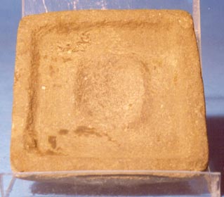 Metate cuadrado con base cuadrada, sin soportes. En el centro tiene un diseño cuadrado, y un borde cuadrado en la parte posterior.