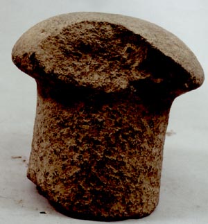 Escultura tallada en piedra de las comúnmente conocidas como espigas. Decoración: Presenta la figura de una cara que no está muy bien definida.