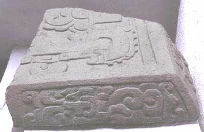 Fragmento de altar, tallado en bajo relieve, decoración en estilo Izapa. En la parte superior tiene dos cabezas monstruosas, en el borde hay bajos relieves enmarcados. En otra vista de frente se observa una cabeza antropomorfa de jaguar, con un glifo. Monumento 14 de Kaminaljuyú.