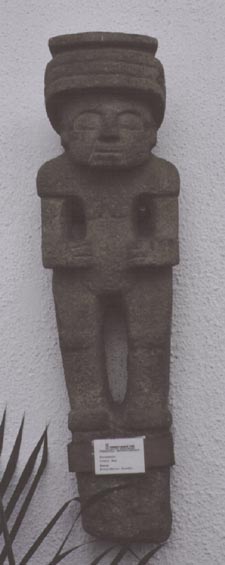 Escultura que representa el dorso de una mujer embarazada, con ambas manos sobre el estómago y hacia el frente. En la espalda lleva un diseño antropomórfico, monstruoso.