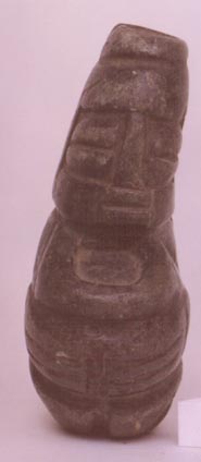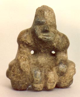 Camahuil, personaje sentado, con las manos sobre el vientre, ojos alargados hinchados. Sobre la cabeza y las manos se forma un círculo con profundiad de 2 mm.