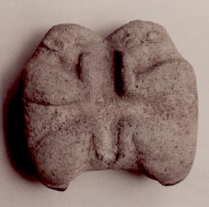 Figurilla que representa dos animales en posición fetal, pegados frente a frente. Los ojos parecen estar cerrados.