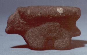 Cuenco zoomorfo de piedra, con pared divergente, base plana, y cuatro soportes cuadrados. No presenta decoración incisa.