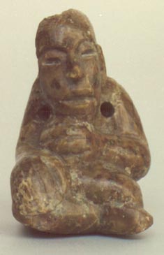Figurilla antropomorfa, personaje sentado, con las piernas cruzadas, con una mano en el pecho y otra sobre la rodilla, tiene las características Olmecas. Tiene un agujero en cada brazo, y posiblemente tenía la función de pectoral.