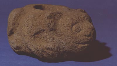 Escultura zoomorfa, tallada, con el hocico cerrado, ojos y nariz protuberante.