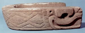 Escultura tallada en piedra en forma de yugo, utilizada en el juego de pelota mesoamericano. Decoración: una serpiente tallada con dos cabezas, una en cada extremo, el cuerpo inciso medio con diseños geométricos. Las cabezas tienen collar con acanaladuras horizontales paralelas.