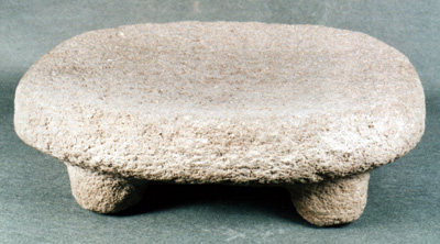 Piedra de moler o metate, fabricado probablemente en basalto o arenisca, huellas de uso en la superficie, forma ovalada con cuatro soportes redondeados. Segun el donador proviene de la finca Venecia, aldea las Joyas, Pueblo Nuevo Viñas, Santa Rosa.