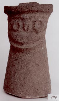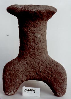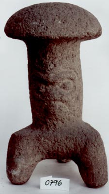 Hongo trípode, sombrero pequeño con un agujero en el centro. Decoración: rostro antropomorfo en forma de antifaz.