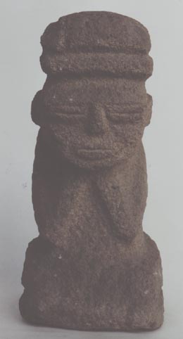 Figurilla antropomorfa, se encuentra hincada con las manos sobre la rodilla, con un sombrero y narigueras y un pequeño collar. Tiene sonaja.