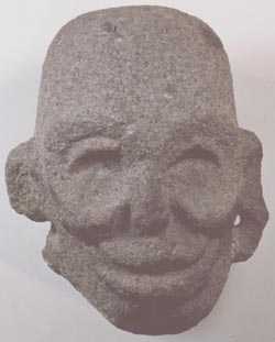 Cabeza antropomorfa, de un anciano de ojos redondos grandes hendidos, pómulos protuberantes, nariz pequeña, boca alargada, sonriente, orejas grandes con orificio para orejeras, sin tocado.