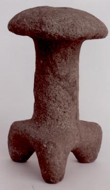 Hongo tallado de base trípode. En la parte superior del sombrero lleva un agujero en el centro, y en el cuerpo del hongo un rostro tallado, que casi no se puede distinguir.