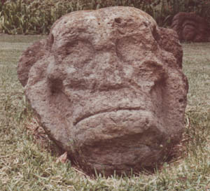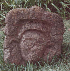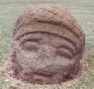 Escultura tallada en forma de espiga, que representa un rostro zoomorfo, con ojos semi-redondeados, boca redondeada, tocado adornado sobre la cabeza. A los lados tiene un diseño en forma de cuadrados.