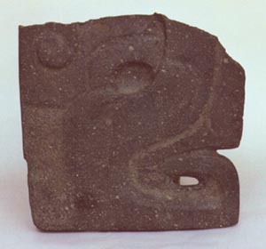 Escultura tallada en forma de hacha, que representa una cabeza zoomorfa, de perfil, con ojo redondeado, fauces abiertas. Tiene un diseño en forma espiral en la parte superior izquierda, y una acanaladura en forma de S invertida a la altura de las fauces.