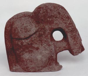 Fragmento de escultura tallada en forma de hacha, con ojo cerrado y una perforación en el centro de la pieza.