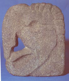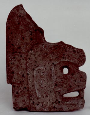 Escultura tallada en forma de hacha que representa un personaje zoomorfo de perfil (probablemente un ave), con el pico alargado y abierto, ojo hendido, una decoración en la parte superior izquierda en forma de plumas. Tiene una perforación en la parte central.