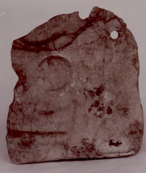 Escultura tallada en mármol, en forma de hacha que representa un personaje antropomorfo, con ojos redondeados y hendidos, boca alargada. Tiene una perforación en la parte superior.