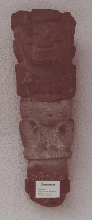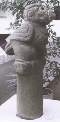 Escultura pedestal tallada en forma de espiga, que representa un personaje de pie, con las manos cruzadas sobre el pecho, mostrando las dos manos. El tamaño de la cabeza no está en proporción con las extremidades inferiores. Parece tener un tocado partido en tres partes. Tiene los ojos rasgados, y la boca ancha, mostrando los…