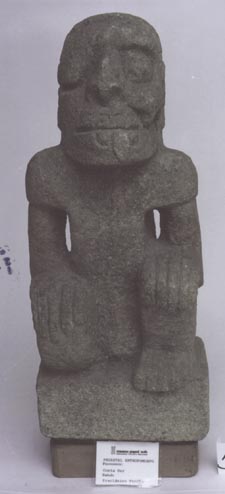 Cántaro de cuerpo globular, base plana, cuello corto, borde redondeado, un asa. Decoración: rostro zoomorfo en relieve, posiblemente un conejo con manos antropomorfas sobre el cuerpo. Donación: Lic. Sergio García Granados. 7 Diciembre 1983.