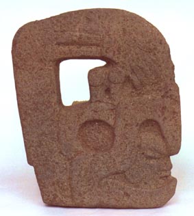 Hacha ceremonial tallada en piedra con figura compuesta. En la parte superior se observa una mano descarnada y abajo de ésta se observa un rostro de ave de cuyo pico emerge un perfil humano en el cual se logran distinguir claramente sus facciones e incluso un par de orejeras. Donación: Ing. Pedro A. Gutierrez.