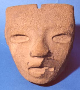Máscara tallada en piedra, que representa un rostro antropomorfo. En la parte superior del rostro presenta una acanaladura. Los ojos son ligeramente alargados, la nariz ancha, la boca entre abierta. La parte de atrás de la máscara es plana. A los lados se observan huellas de lo que podrían ser las orejas.