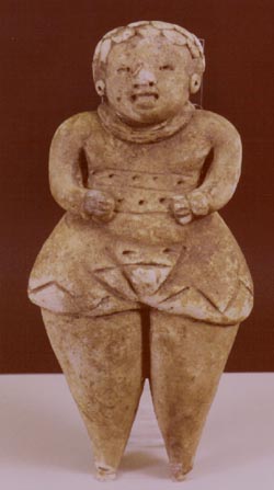 Figurilla femenina, personaje de cuerpo ancho, falda corta, con diseños incisos, tocado en forma de trenza. El personaje no se puede parar, ya que sus piernas son muy anchas y no tiene pies.