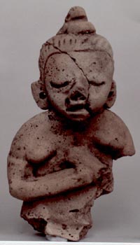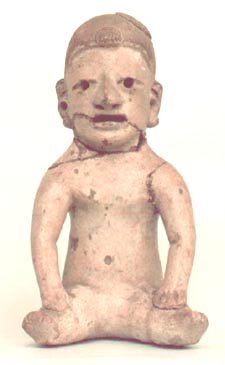 Figurilla antropomorfa, personaje sentado con las manos sobre las rodilla, ojos excisos, boca entreabierta, orejas y nariz grandes, ombligo en el vientre, tocado en forma de copete.