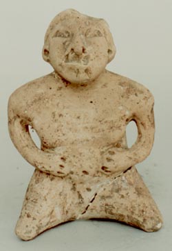 Figurilla antropomorfa, personaje sentado con las piernas extendidas al frente, manos sobre el vientre, ojos grandes, orejeras. No presenta tocado.
