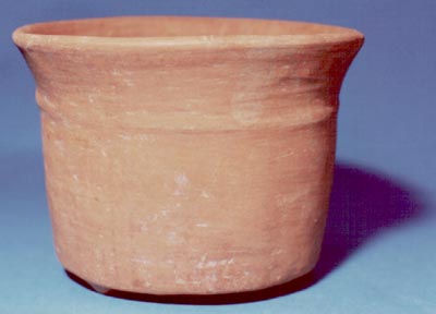 Cuenco de pared recta, borde ligeramente evertido, base trípode, soportes cónicos.