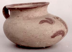 Vasija tipo zapato, cuerpo subglobular, cuello curvo divergente con una asa, base plana, borde redondeado. Decoración: sobre el borde una banda de color rojo, en la parte de enfrente decoración incisa gruesa con diseños en rojo sobre engobe crema. Donación: Lic. Sergio García Granados. 7/12/83.
