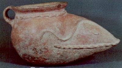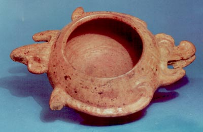 Zapato con borde divergente y base plana. La parte de enfrente está decorada de forma zoomorfa. Opuesto a la punta se encuentra un asa redonda. 27/1/05 Según el Dr. Dennis Guerra Centeno, representa la cabeza de una serpiente cantil (Agkistrodon bilineatus).