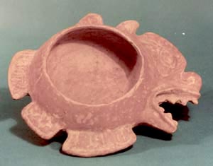 Cuenco de pared curva, base plana y pestaña medial en forma de animal, con cabeza y boca abierta. Decorado en técnica Usulután.